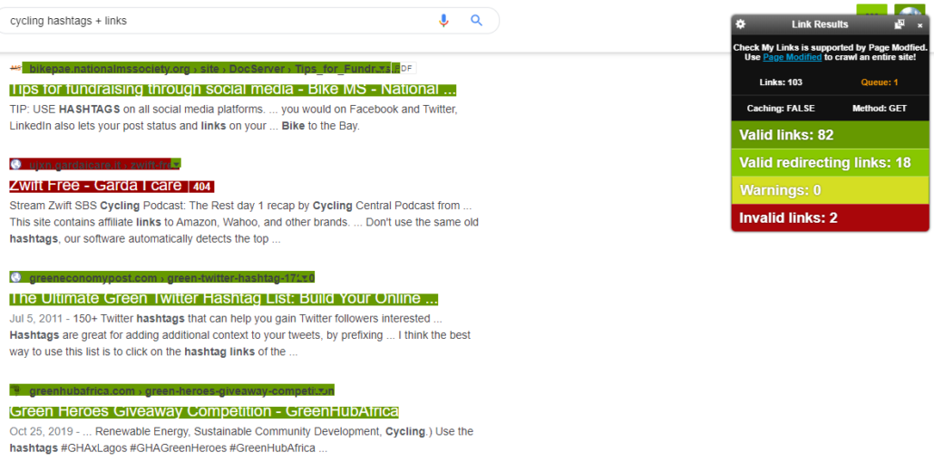 For e.g., if I have to search for websites related to cycling hashtags. I will simply type in cycling hashtags + Links. Once you find the list of all your keyword website, you need to find broken links (404) in the search itself. You can do this by installing a Chrome Plugin for finding 404 bad links. The plugin is known as check my links.