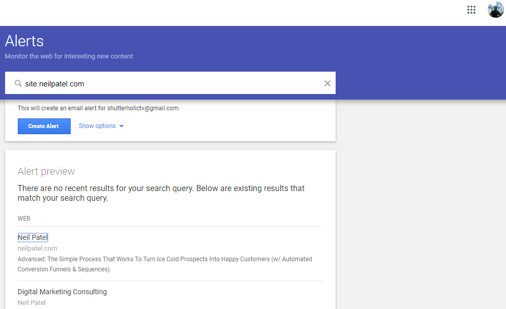 When you interact with the site owners frequently there is a trust that develops. Post which you can also request them to exchange links. An easy way of doing this to create a Google alert. This way whatever is changing on your competitor’s website you get get a prompt from Google. Like I have for Neil Patel.com. All you need to do is just type site: “Domain Name”.