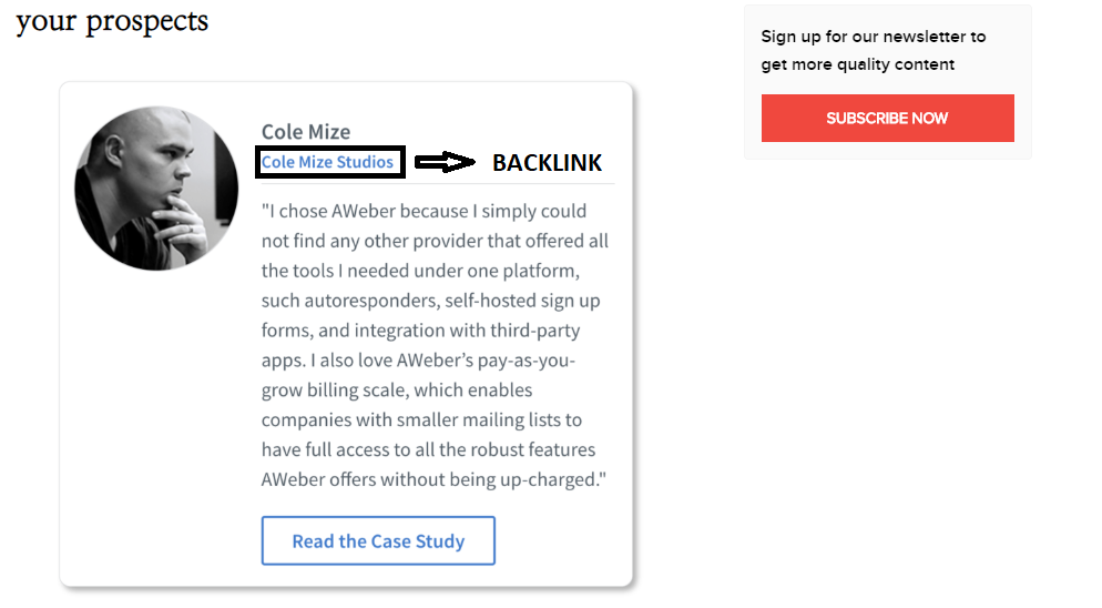 Every testimonial will have a place for the author. This is exactly where you can place your link. Take a look at the example below. This is an example of a well-written testimonial with “cole mize studios” acting as a hyperlink to the page of Cole Mize.